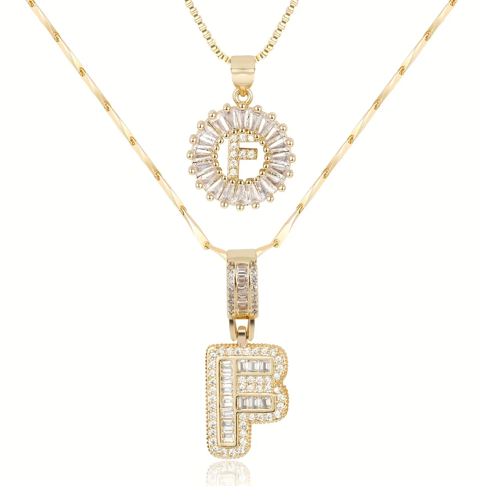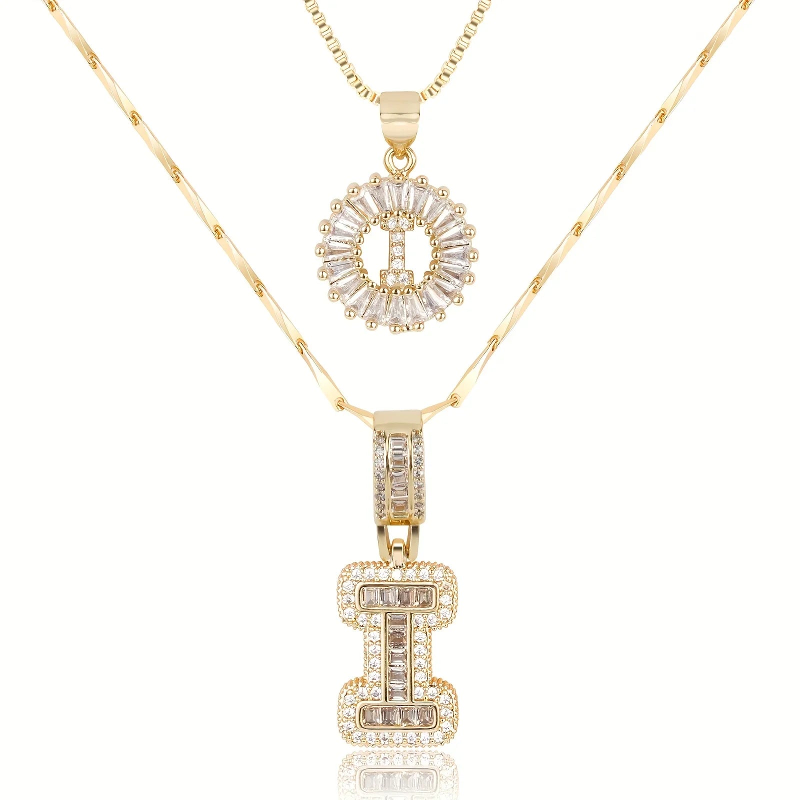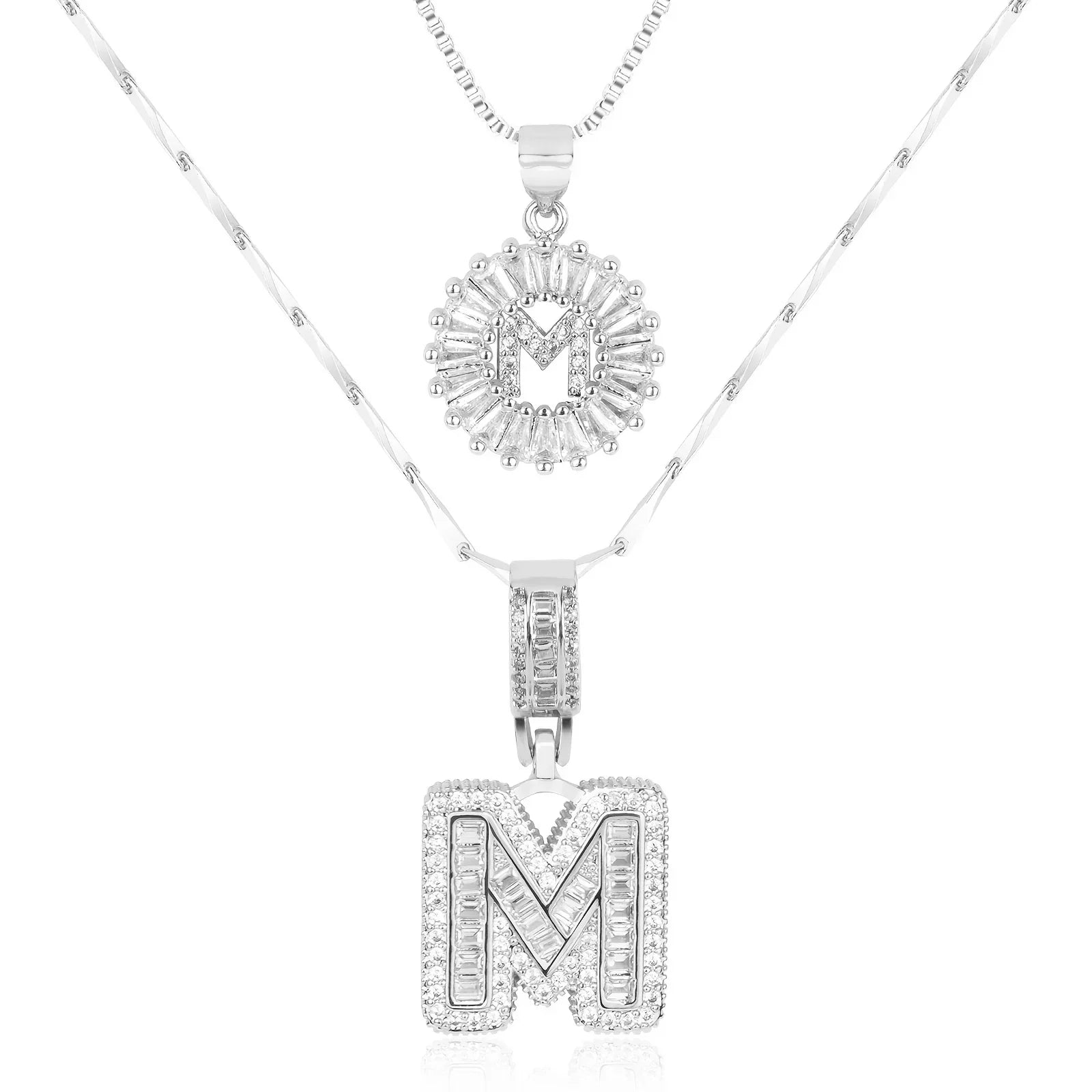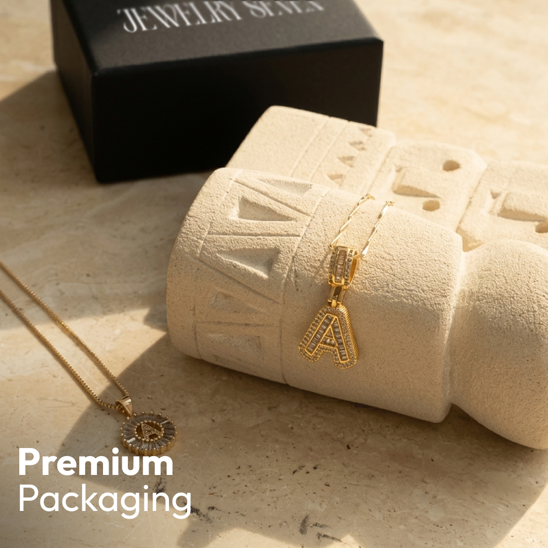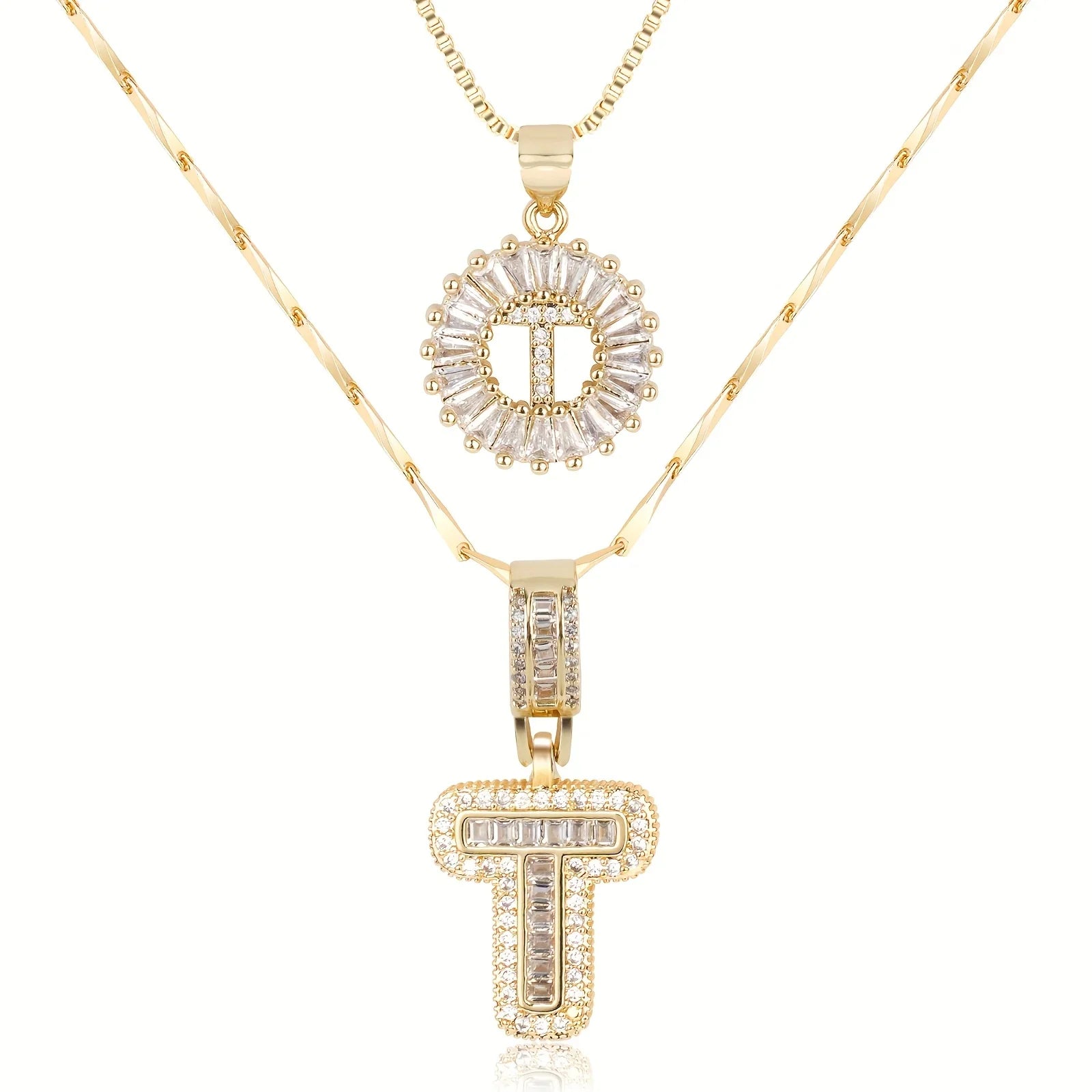 • Long Necklace: Designed with a slightly thicker and more defined chain, this piece features a larger diamond initial pendant that stands out with confident sophistication. The contrast between the two chains creates depth and a stylish layered effect.