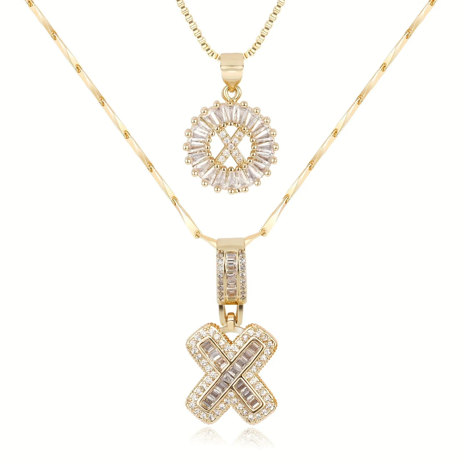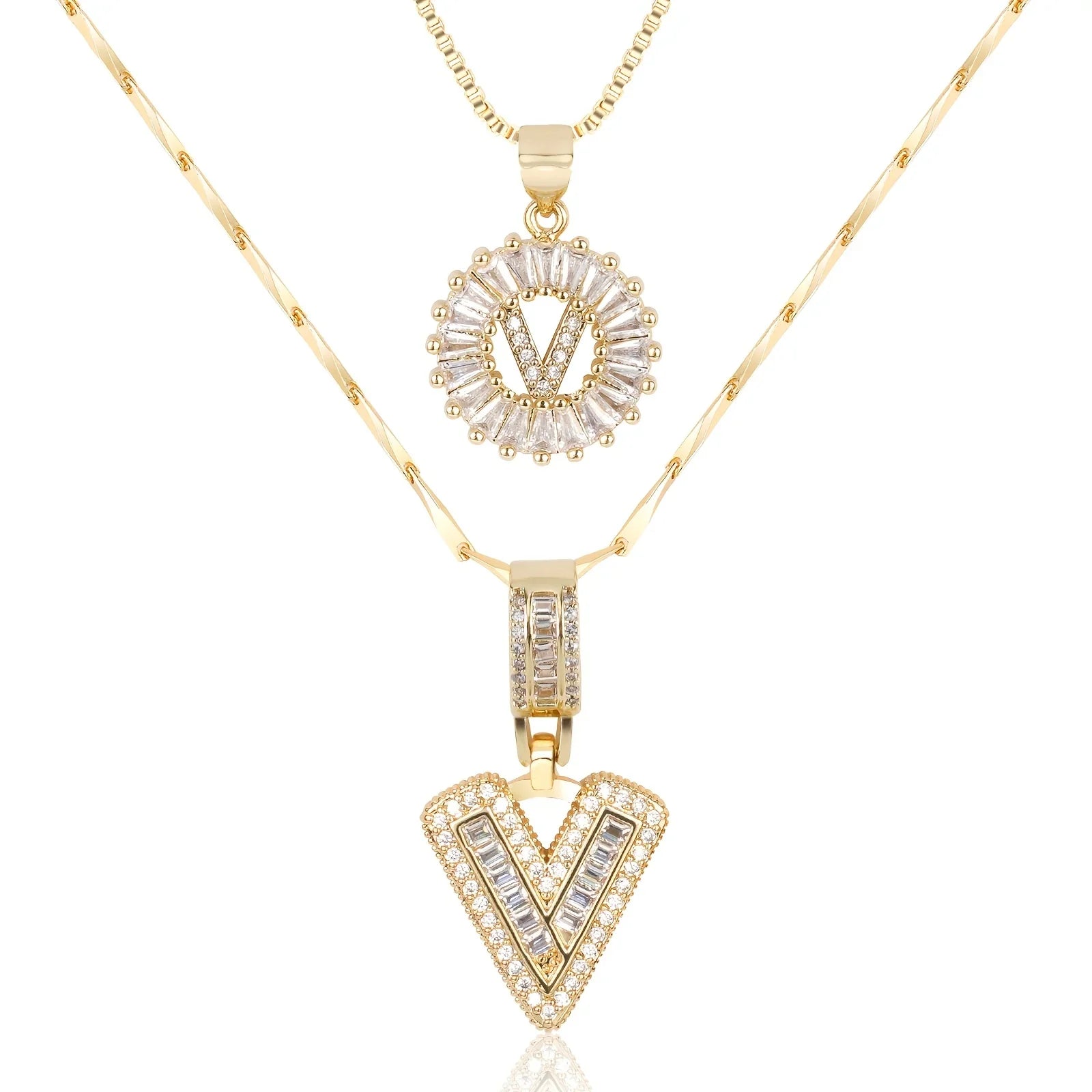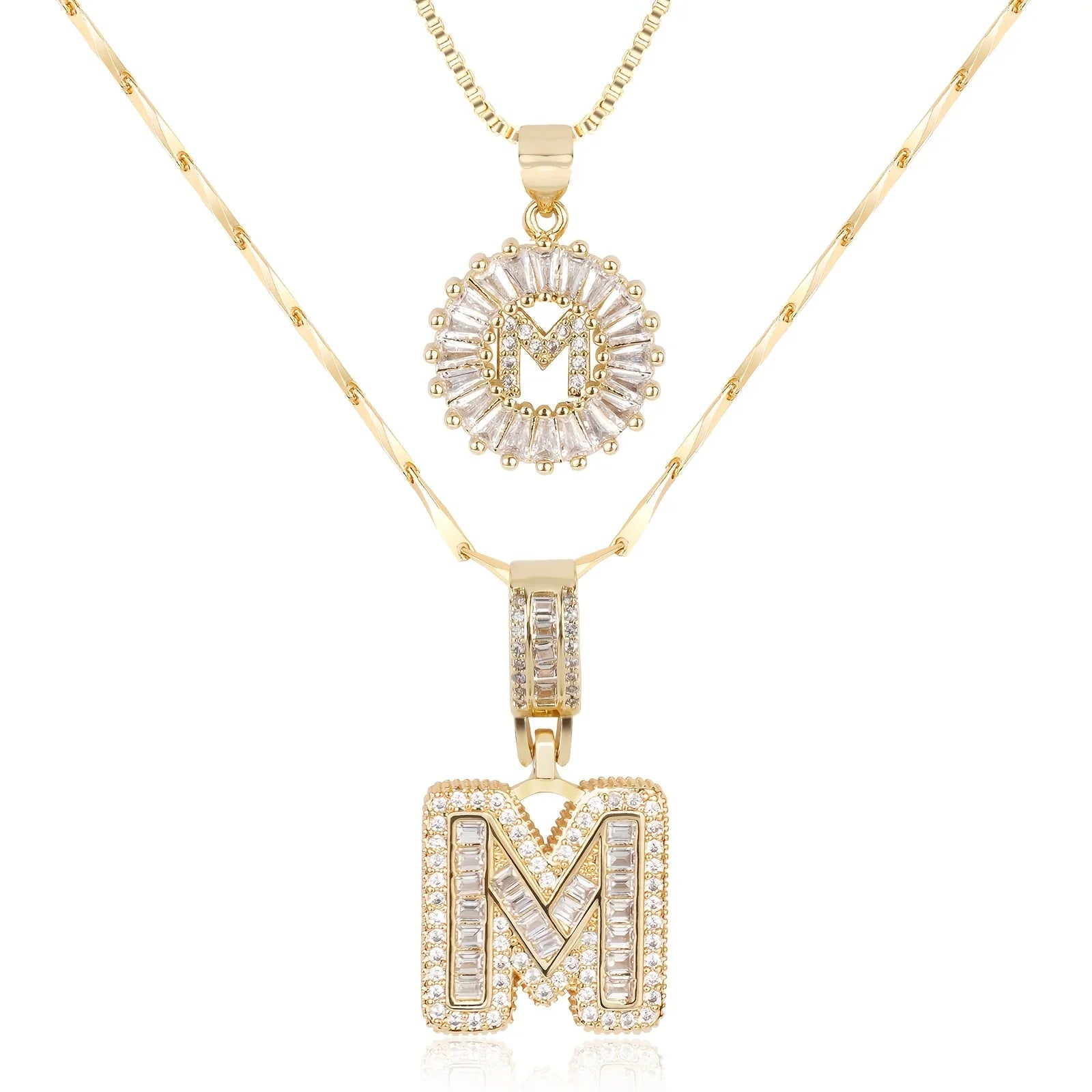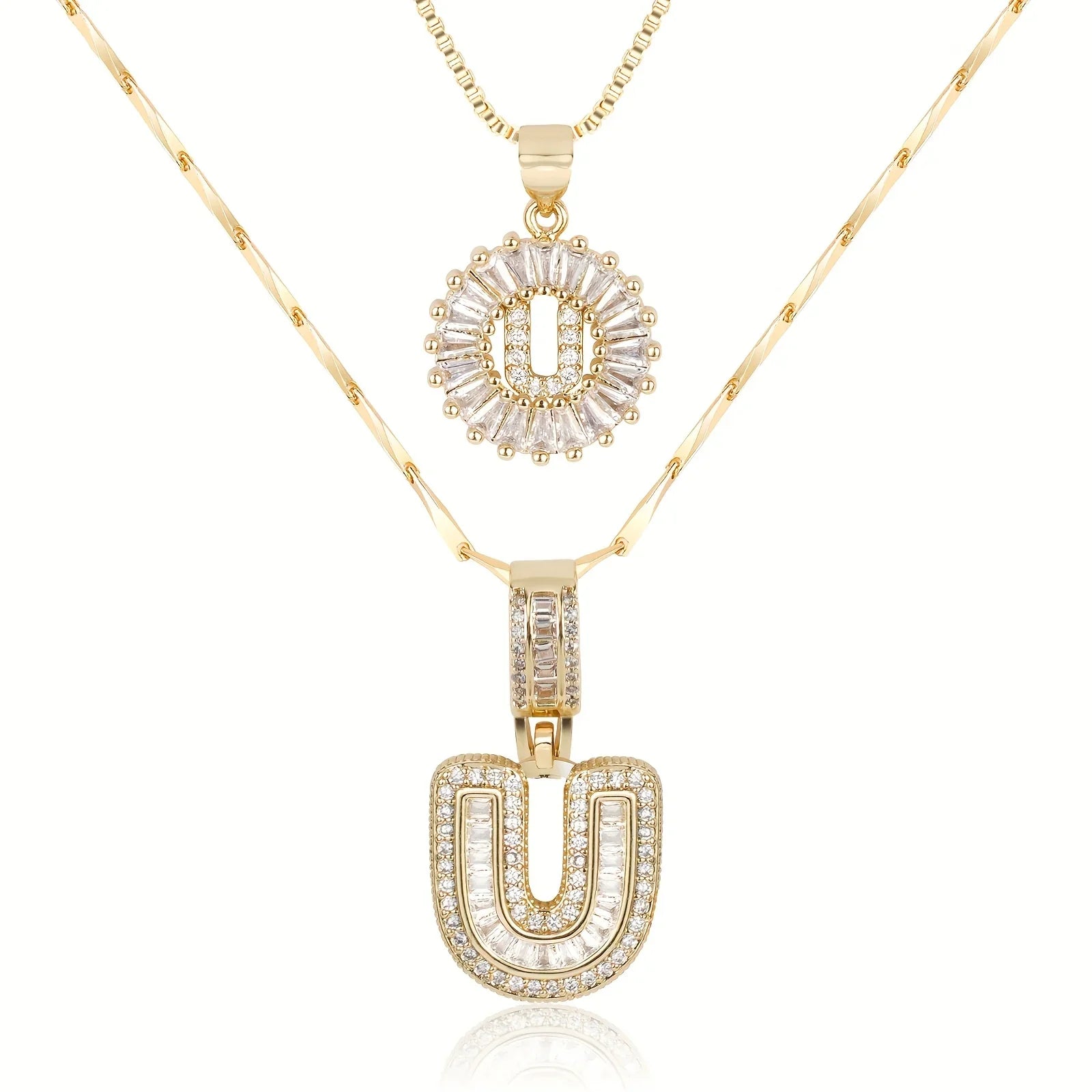 • Long Necklace: Designed with a slightly thicker and more defined chain, this piece features a larger diamond initial pendant that stands out with confident sophistication. The contrast between the two chains creates depth and a stylish layered effect.